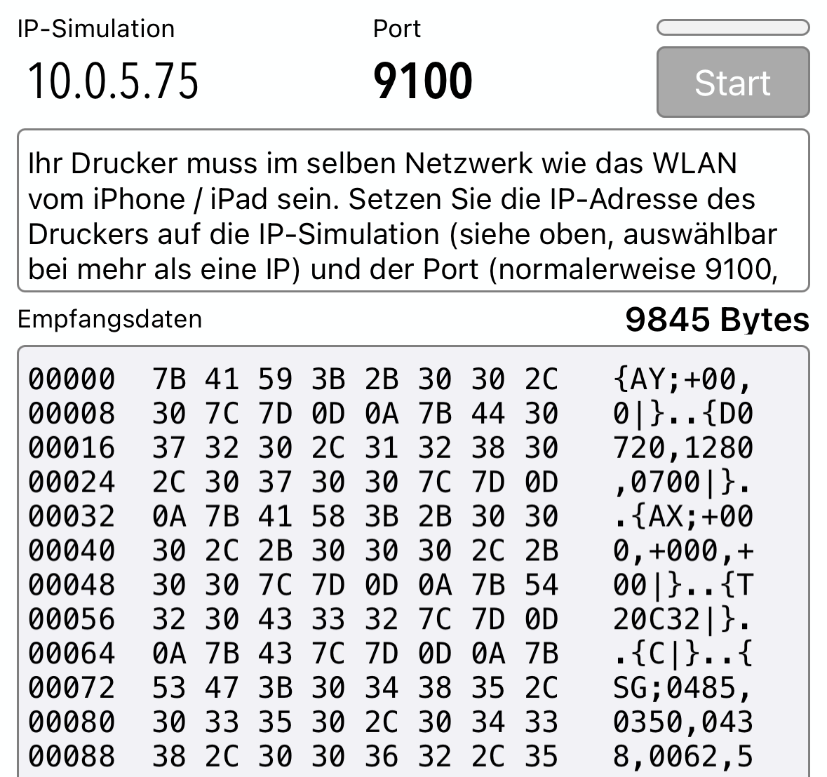 Sind alle Einstellungen gemacht, kann der Datenempfang gestartet werden. Wenn Sie jetzt für den Drucker einen Druckauftrag starten, werden die Daten eingelesen und angezeigt. Bei Stopp des Datenempfangs, werden die Daten im iPhone lokal mit Zeitstempel gespeichert (bei vorhandenen Daten).